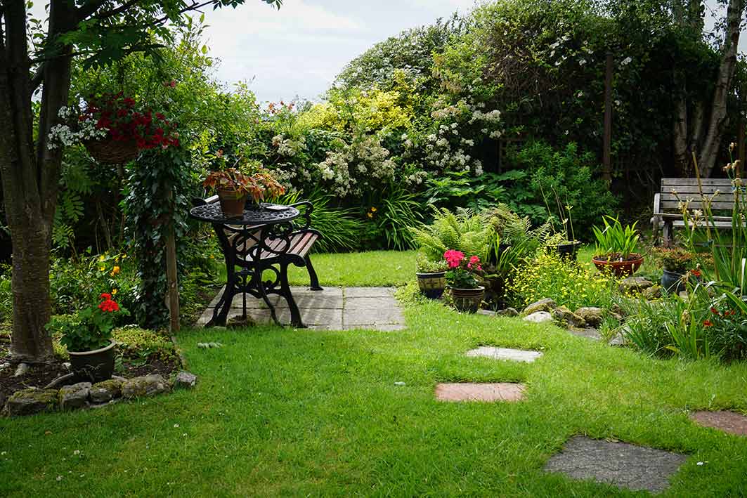 The conservatory gets a little bit more, but only for a short time and the patio only catches some rays on the table top through the conservatory window.