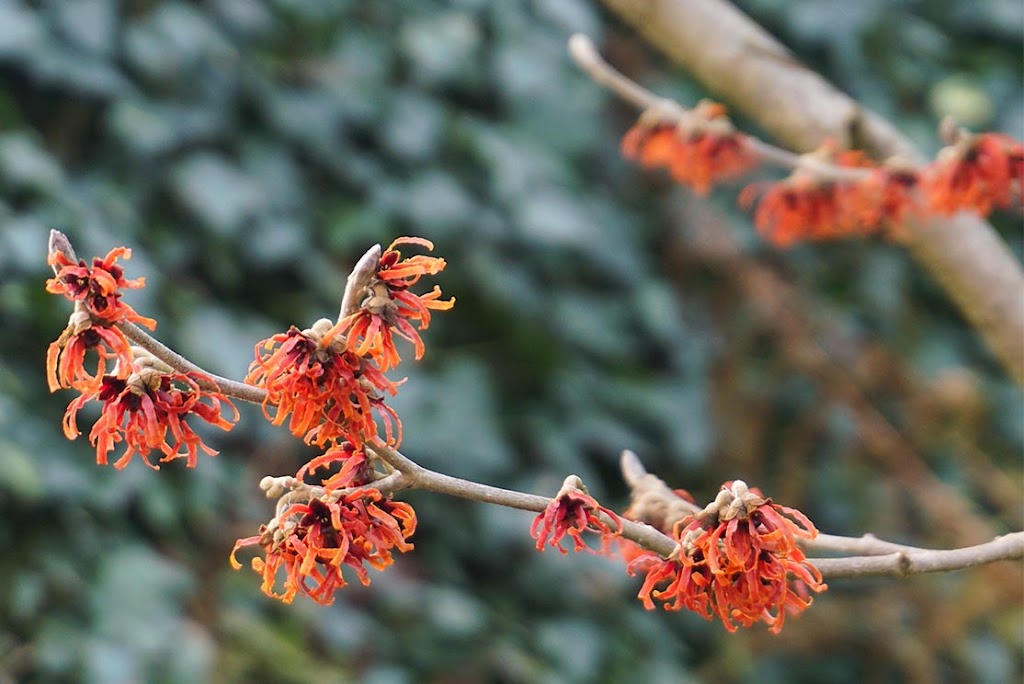 In flower now are: mahonia, hellebores (some lovely large clumps and some rather spindly specimens), large daffodils, tiny tete-a-tete narcissus, pink heather, yellow epimedium, winter honeysuckle, white periwinkle, rosemary, chionadoxa, primrose, erythronium snowflake, pulmonaria, the pink corydalis and a few grape hyacinths (that I keep forgetting are there). The hazel is monoecious which means they have male and female flowers on the same plant. The male and female flowers of the tortured hazel look so different to each other – the male flowers are the lovely yellow catkins that dangle and are blown about in the wind so the pollen lands on the tiny red female flowers. However they can’t be self pollinated, they must be pollinated by another hazel. There are only a few flowers on the Pieris so maybe there has been some frost damage – we shall see if we get more later.